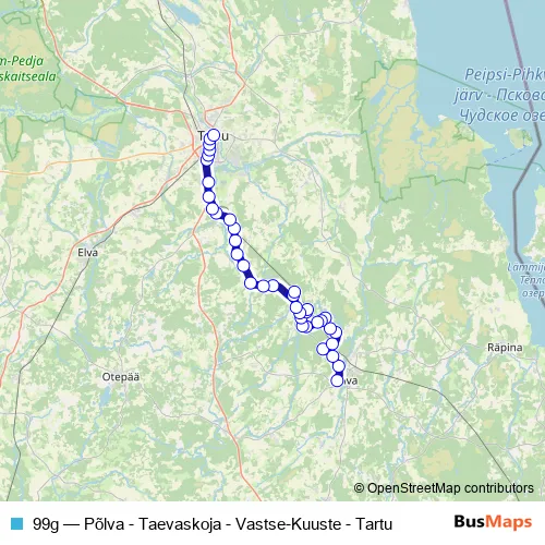 The first stop of the 99g bus route is Põlva bussijaam and the last stop is Tartu bussijaam. 99g (Põlva - Taevaskoja - Vastse-Kuuste - Tartu) is operational during everyday.