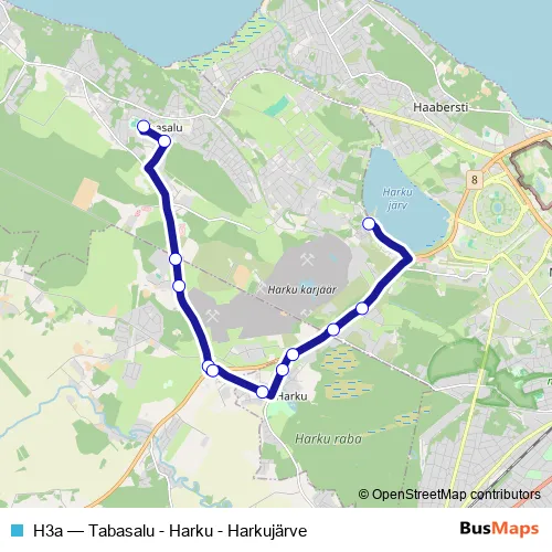 The first stop of the H3a bus route is Kooli and the last stop is Harkujärve. H3a (Tabasalu - Harku - Harkujärve) is operational during on weekdays.