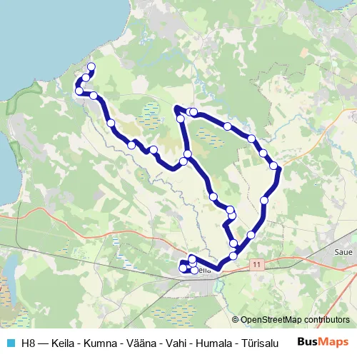 The first stop of the H8 bus route is Pargimaja and the last stop is Hallikivi. H8 (Keila - Kumna - Vääna - Vahi - Humala - Türisalu) is operational during on weekdays.