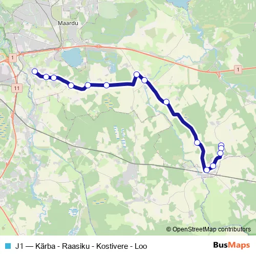 The first stop of the J1 bus route is Kärba and the last stop is Loo. J1 (Kärba - Raasiku - Kostivere - Loo) is operational during on weekdays.