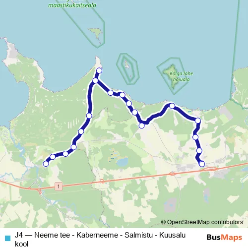 The first stop of the J4 bus route is Neeme tee and the last stop is Kuusalu kool. J4 (Neeme tee - Kaberneeme - Salmistu - Kuusalu kool) is operational during on weekdays.