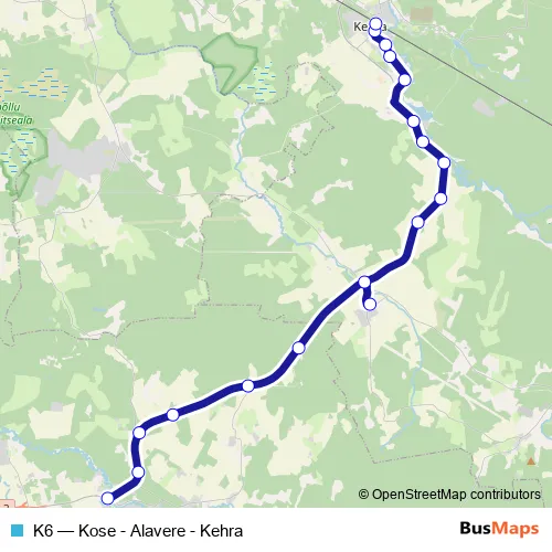 The first stop of the K6 bus route is Kose 2 and the last stop is Kehra raudteejaam. K6 (Kose - Alavere - Kehra) is operational during everyday.