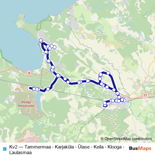 The first stop of the Kv2 bus route is Spordihoone and the last stop is Spordihoone. Kv2 (Tammermaa - Karjaküla - Ülase - Keila - Klooga - Laulasmaa) is operational during on weekdays.