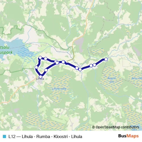 The first stop of the L12 bus route is Lihula and the last stop is Lihula. L12 (Lihula - Rumba - Kloostri - Lihula) is operational during on weekdays.