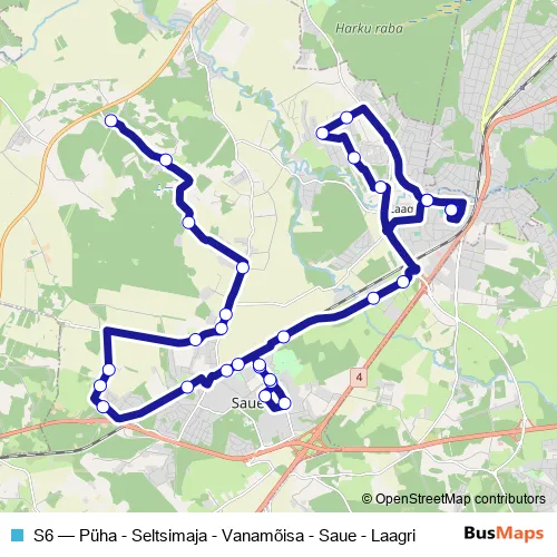The first stop of the S6 bus route is Roosi tee and the last stop is Laagri kool. S6 (Püha - Seltsimaja - Vanamõisa - Saue - Laagri) is operational during on weekdays.