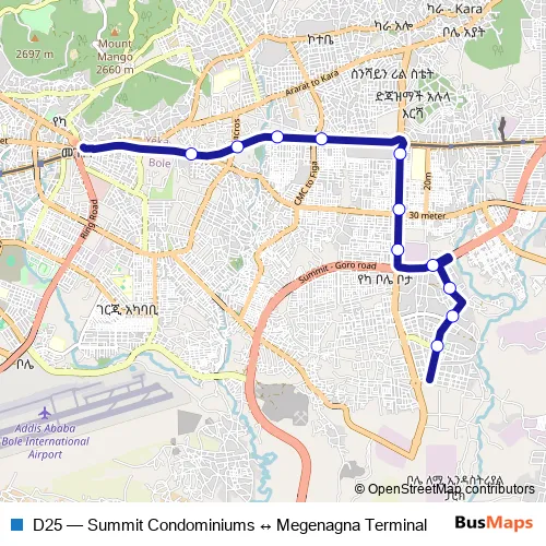 The first stop of the D25 bus route is Gate 2 and the last stop is Gurd-shola. D25 (Summit Condominiums ↔ Megenagna Terminal) is operational during everyday.