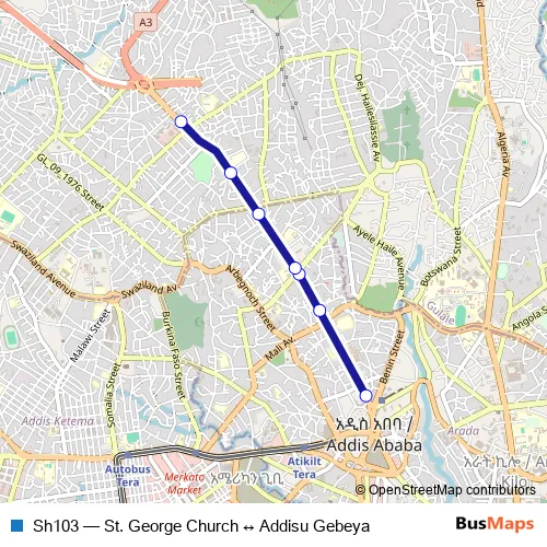 The first stop of the Sh103 bus route is St. George Church (Total) and the last stop is Adissu Gebeya. Sh103 (St. George Church ↔ Addisu Gebeya) is operational during everyday.