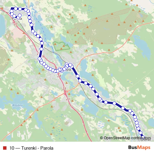 The first stop of the 10 bus route is Turenki linja-autoasema and the last stop is Parola A. 10 (Turenki - Parola) is operational during on weekdays.