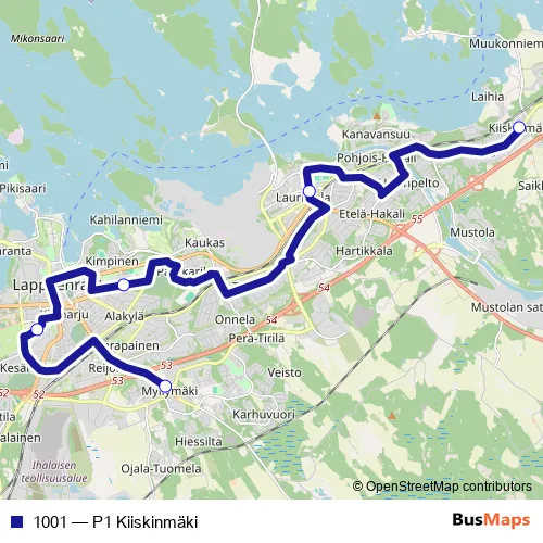 The first stop of the 1001 bus route is Viipurintie-Ajurinkatu keskustaan and the last stop is Kiiskinmäki. 1001 (P1 Kiiskinmäki) is operational during everyday.