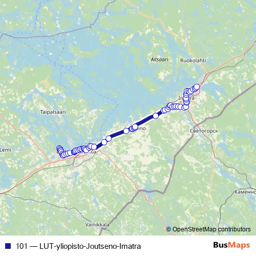 The first stop of the 101 bus route is LUT-Yliopisto and the last stop is Vuoksenniska Imatra P. 101 (LUT-yliopisto-Joutseno-Imatra) is operational during on weekdays.