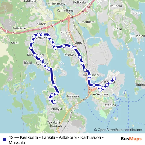 The first stop of the 12 bus route is Mussalo, Rajakalliontie 12 L and the last stop is Kantasatama paikallisliikenneterminaali päätepysäkki (Kotka). 12 (Keskusta - Lankila - Aittakorpi - Karhuvuori - Mussalo) is operational during everyday.