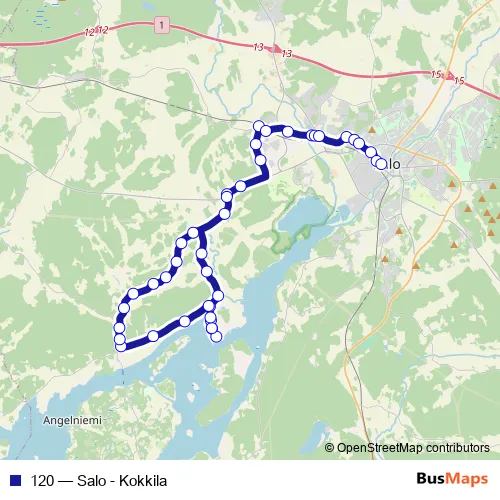 The first stop of the 120 bus route is Kokkila th I and the last stop is Salo linja-autoasema. 120 (Salo - Kokkila) is operational during on weekdays.