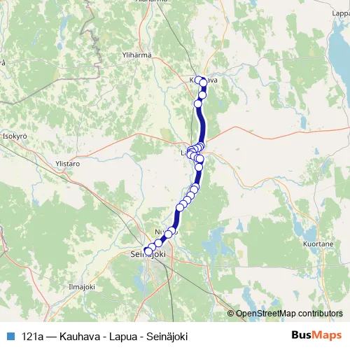 The first stop of the 121a bus route is Kauhava Matkahuolto and the last stop is Seinäjoen matkakeskus, päätepysäkki. 121a (Kauhava - Lapua - Seinäjoki) is operational during on weekdays.