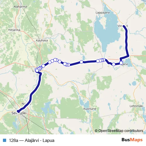 The first stop of the 128a bus route is Alajärvi Abc and the last stop is Lapua Matkakeskus. 128a (Alajärvi - Lapua) is operational during on weekdays.