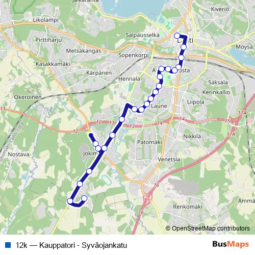The first stop of the 12k bus route is Kauppatori B2 and the last stop is Syväojankatu (päätepysäkki). 12k (Kauppatori - Syväojankatu) is operational during on weekdays.