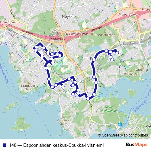 The first stop of the 148 bus route is Kaitaan koulu and the last stop is Espoonlahdenkuja. 148 (Espoonlahden keskus-Soukka-Iivisniemi) is operational during on weekdays.