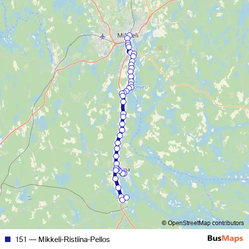The first stop of the 151 bus route is Mikkeli laituri 4 and the last stop is Pellosniemi. 151 (Mikkeli-Ristiina-Pellos) is operational during everyday.