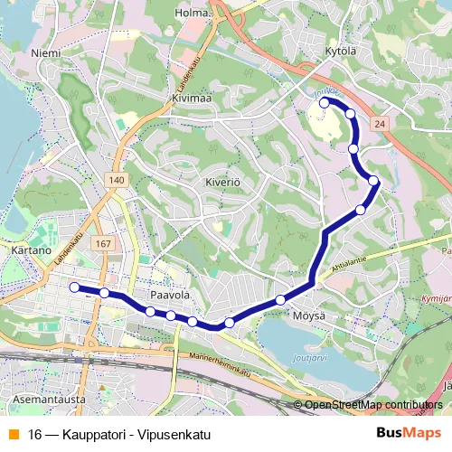 The first stop of the 16 bus route is PH-Ammatti-Instituutti and the last stop is Kauppatori A. 16 (Kauppatori - Vipusenkatu) is operational during on weekdays.
