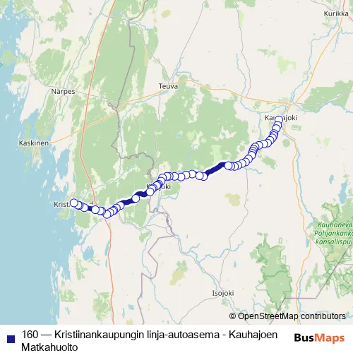 The first stop of the 160 bus route is Kauhajoen Matkahuolto and the last stop is Kristiinankaupungin linja-autoasema. 160 (Kristiinankaupungin linja-autoasema - Kauhajoen Matkahuolto) is operational during on weekdays.