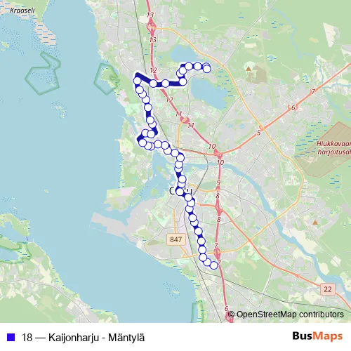 The first stop of the 18 bus route is Mäntylä P and the last stop is Kaijonlahdentie E. 18 (Kaijonharju - Mäntylä) is operational during on weekdays.