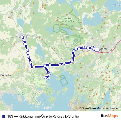 The first stop of the 183 bus route is Siuntio matkahuolto and the last stop is Kirkkonummi mk. 183 (Kirkkonummi-Överby-Störsvik-Siuntio) is operational during on weekdays.