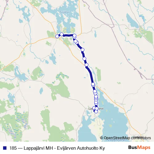 The first stop of the 185 bus route is Lappajärvi Mh and the last stop is Evijärven Autohuolto Ky. 185 (Lappajärvi MH - Evijärven Autohuolto Ky) is operational during on weekdays.