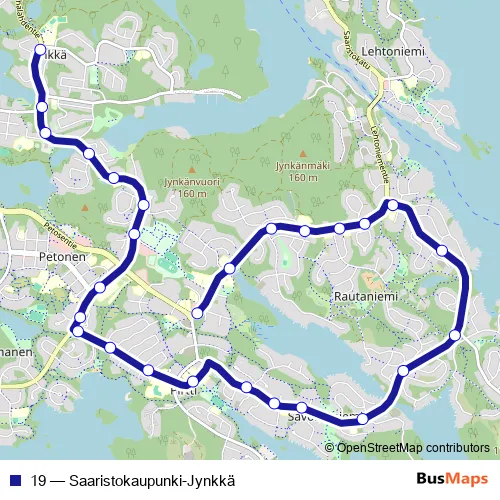 The first stop of the 19 bus route is Petosentie P and the last stop is Jynkkä P. 19 (Saaristokaupunki-Jynkkä) is operational during on weekdays.