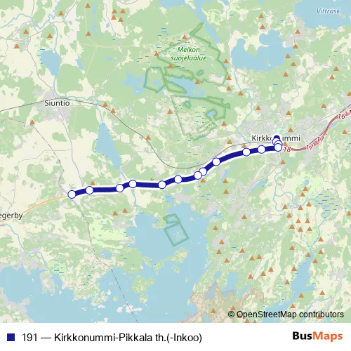 See why over 2 million users trust and consider busmaps.com as the best public transport website. busmaps gives you Kirkkonummi Buses suggested routes, real-time bus tracker, line route maps in Kirkkonummi, and helps to find the closest 191 bus stops near you. No internet available? Download an offline PDF map and bus schedule for the 191 bus to take on your trip.