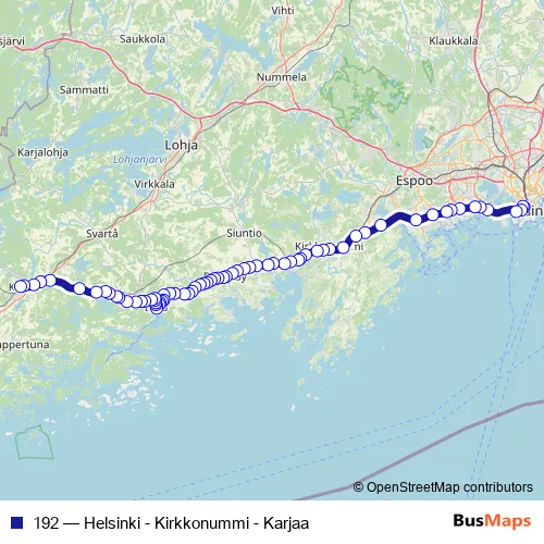 Click here to view the nearest 192 - Helsinki - Kirkkonummi - Karjaa bus stop.