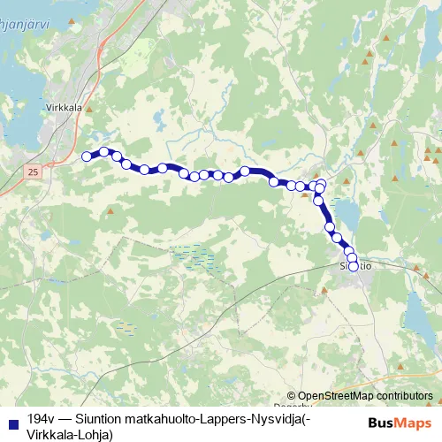 The first stop of the 194v bus route is Nysvidja and the last stop is Siuntio matkahuolto. 194v (Siuntion matkahuolto-Lappers-Nysvidja(-Virkkala-Lohja)) is operational during on weekdays.