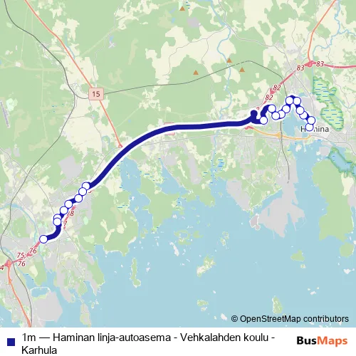 The first stop of the 1m bus route is Hamina linja-autoasema and the last stop is Karhula Y (Karjalantie paikallisliikenne länteen). 1m (Haminan linja-autoasema - Vehkalahden koulu - Karhula) is operational during on weekdays.