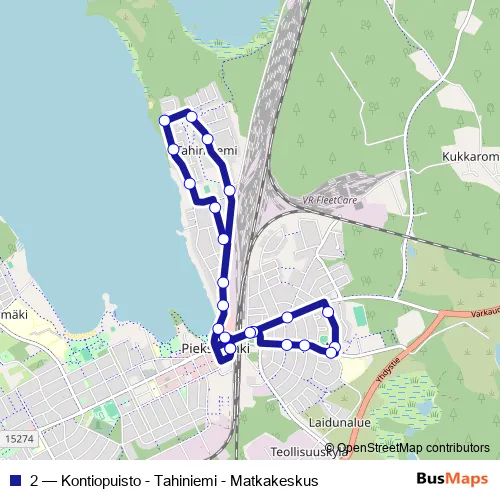 The first stop of the 2 bus route is Pieksämäki matkakeskus and the last stop is Pieksämäki matkakeskus. 2 (Kontiopuisto - Tahiniemi - Matkakeskus) is operational during on weekdays.