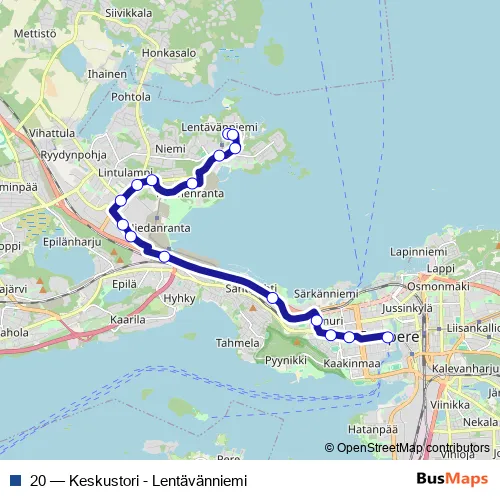 Bus 20 - Keskustori - Lentävänniemi Schedule in Tampere