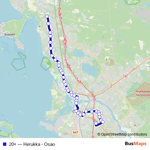The first stop of the 20+ bus route is Oravaisenkuja E and the last stop is Kotkantien oppilaitokset P. 20+ (Herukka - Osao) is operational during on weekdays.
