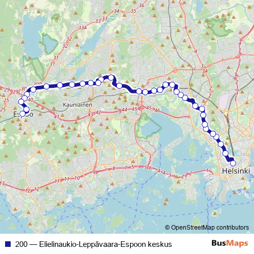 The first stop of the 200 bus route is Elielinaukio and the last stop is Espoon asema. 200 (Elielinaukio-Leppävaara-Espoon keskus) is operational during everyday.
