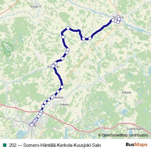 The first stop of the 202 bus route is Somero linja-autoasema and the last stop is Salo, linja-autoasema. 202 (Somero-Häntälä-Kerkola-Kuusjoki-Salo) is operational during on weekdays.
