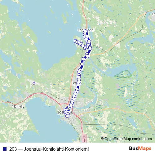 The first stop of the 203 bus route is Kontioniemi and the last stop is Peltola E. 203 (Joensuu-Kontiolahti-Kontioniemi) is operational during on weekdays.