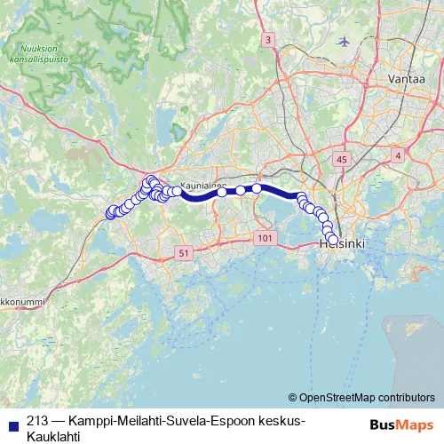 See why over 2 million users trust and consider busmaps.com as the best public transport website. busmaps gives you Espoo Buses suggested routes, real-time bus tracker, line route maps in Espoo, and helps to find the closest 213 bus stops near you. No internet available? Download an offline PDF map and bus schedule for the 213 bus to take on your trip.