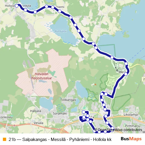 The first stop of the 21b bus route is Terveystie and the last stop is Hollola Kk. 21b (Salpakangas - Messilä - Pyhäniemi - Hollola kk) is operational during on weekdays.