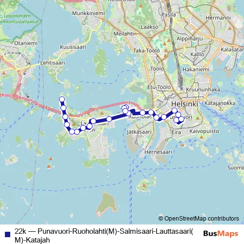 Bus 22k - Punavuori-Ruoholahti(M)-Salmisaari-Lauttasaari(M)-Katajah in Helsinki: Stops & Timetable