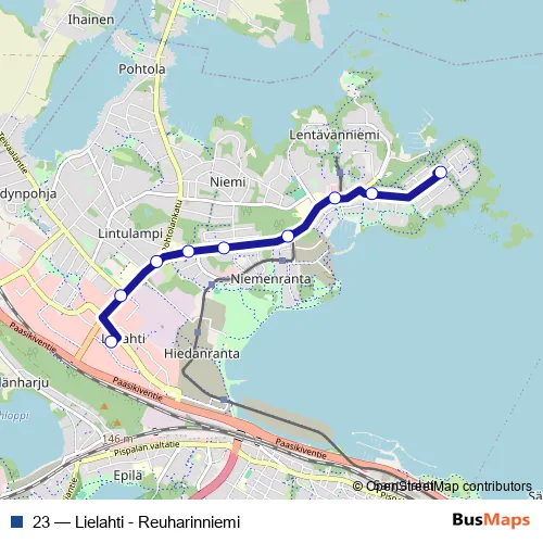 The first stop of the 23 bus route is Reuharinniemi and the last stop is Lielahti E. 23 (Lielahti - Reuharinniemi) is operational during everyday.