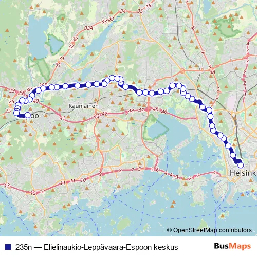 The first stop of the 235n bus route is Elielinaukio and the last stop is Espoon asema. 235n (Elielinaukio-Leppävaara-Espoon keskus) is operational during everyday.