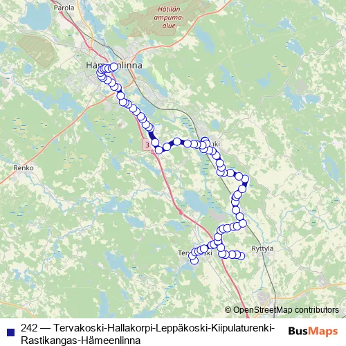 The first stop of the 242 bus route is Tervakosken koulu and the last stop is Hämeenlinna linja-autoasema, tulolaituri. 242 (Tervakoski-Hallakorpi-Leppäkoski-Kiipulaturenki-Rastikangas-Hämeenlinna) is operational during on weekdays.