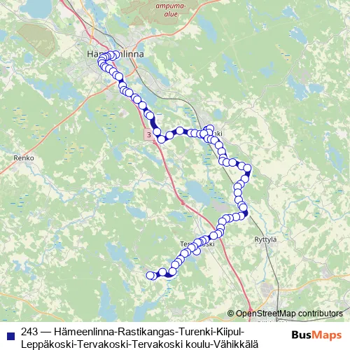 The first stop of the 243 bus route is Hämeenlinna linja-autoasema, laituri 3 and the last stop is Kirkkoportintie th I. 243 (Hämeenlinna-Rastikangas-Turenki-Kiipul-Leppäkoski-Tervakoski-Tervakoski koulu-Vähikkälä) is operational during on weekdays.