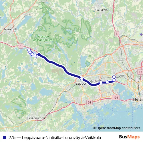 Bus 275 - Leppävaara-Nihtisilta-Turunväylä-Veikkola: Full Schedule in Helsinki