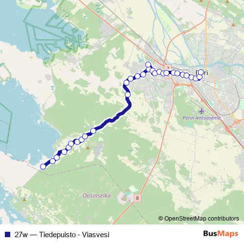 The first stop of the 27w bus route is Viasvesi Oosinselkä and the last stop is Pori, Kauppatori. 27w (Tiedepuisto - Viasvesi) is operational during on weekdays.