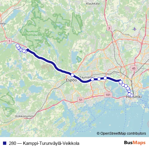 Bus 280 - Kamppi-Turunväylä-Veikkola: Full Schedule in Helsinki