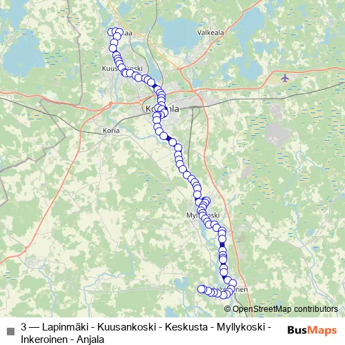 Bus 3 - Lapinmäki - Kuusankoski - Keskusta - Myllykoski - Inkeroinen - Anjala in Kouvola: Stops & Timetable