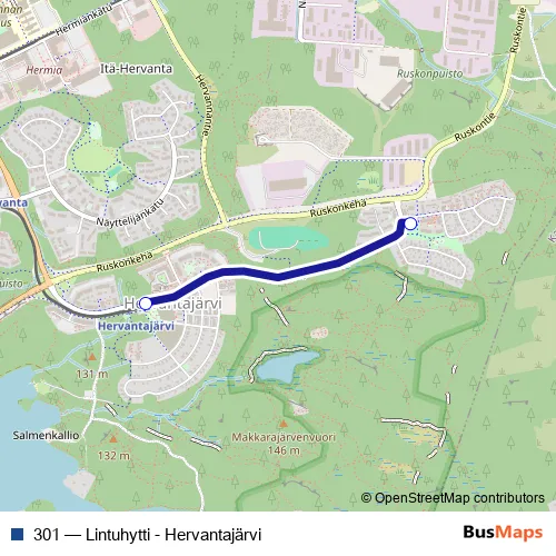 The first stop of the 301 bus route is Hervantajärvi C and the last stop is Lintuhytti. 301 (Lintuhytti - Hervantajärvi) is operational during everyday.