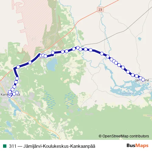 The first stop of the 311 bus route is Kankaanpään linja-autoasema and the last stop is Peijarintie I. 311 (Jämijärvi-Koulukeskus-Kankaanpää) is operational during on weekdays.
